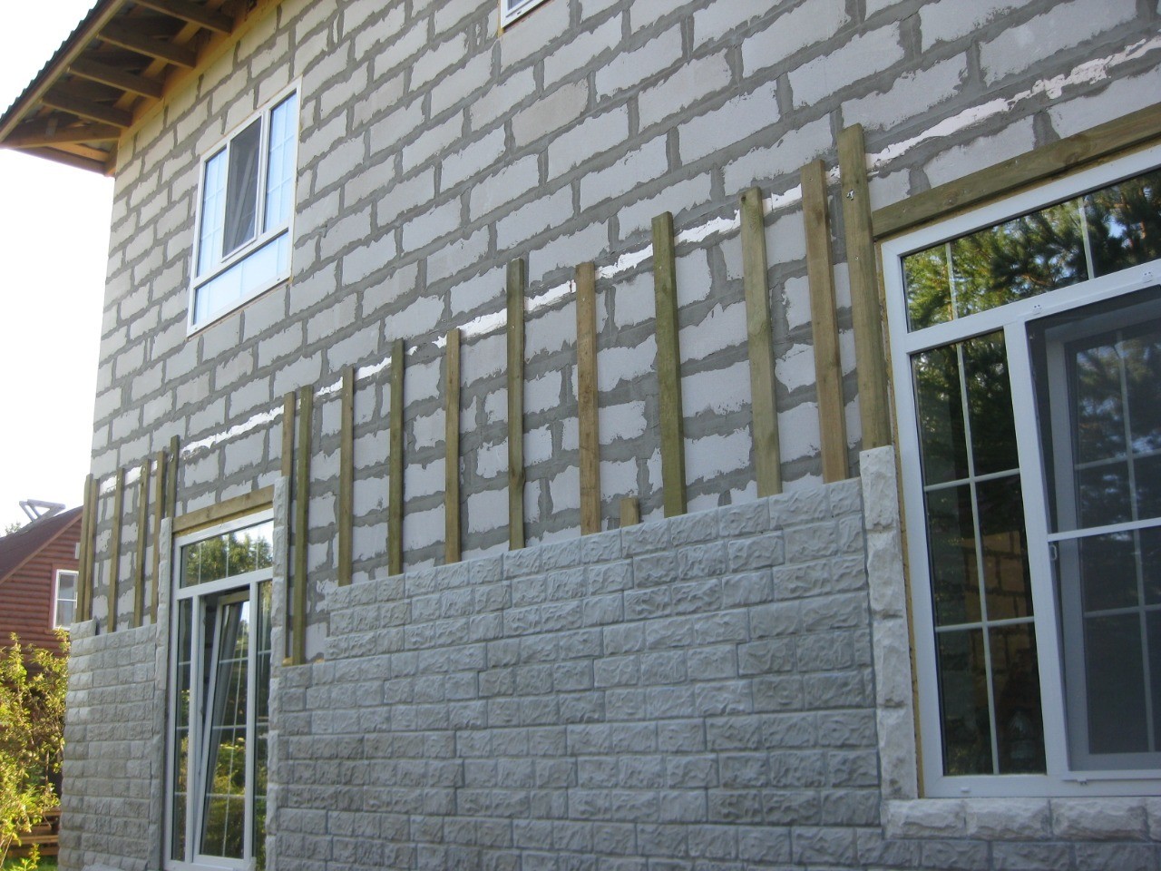 Крепление панелей производится на деревянные антисептированные направляющие с помощью саморезов. Такой способ крепления значительно надёжнее, чем на фасадный клей. Панели никогда не отвалятся, кроме того невероятно расширяются возможности для облицовки.